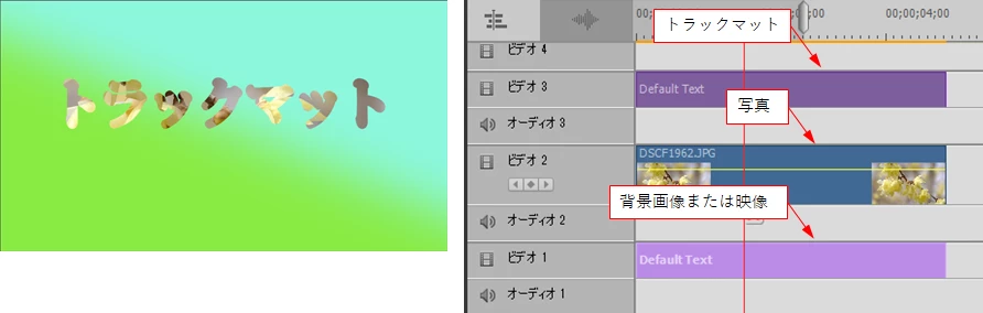 はじめまして、現在スライドショーをelements 2019を用いて作成しております。今エフェクトの練習をしていて、トラックマット機能をあれこれいじっていたのですが、写真、テキストの順でテキストを透過?させることはできたのですが、テキストの背景色を黒以外にしたい場合はどうすれば良いでしょうか。イメージとしてはオレンジのカラーマットにテキストがあり、そのテキストの下に写真が見える感じです。トラックマットを複数適用したり、あるいは透過の度合いを調整しましたがダメでした。どなかたご回答お待ちしております。
