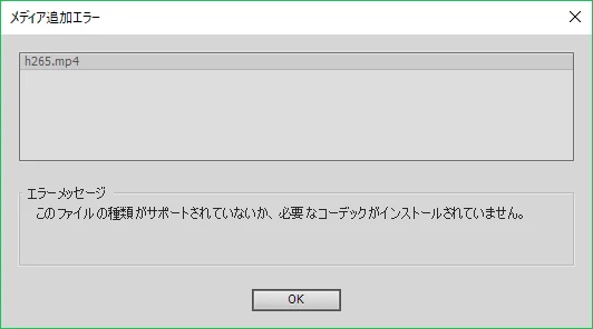 形式「H.265」のファイルをPremiere Elements 15に読み込んだら、エラーメッセージが出ました(下図)。