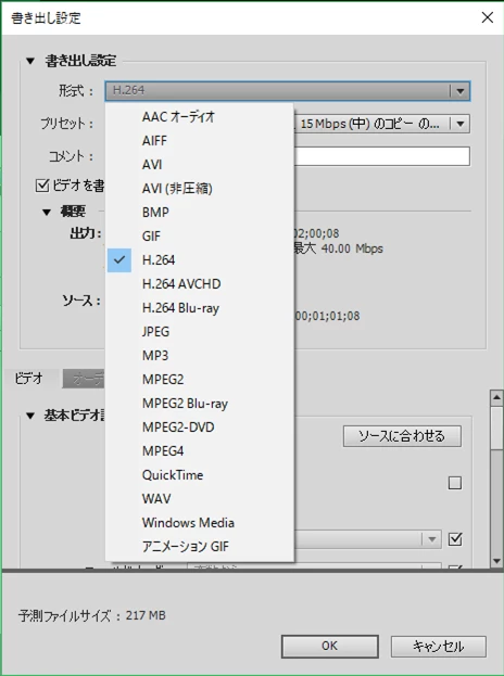また、Premiere Elements 15の書き出し設定の形式には「H.265」がありません(下図)。