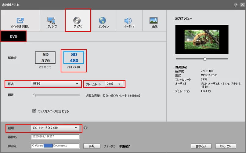 4、手順 書き出しと共有→ディスク→解像度 SD 480→形式 MPEG→解像度2997 →ISOイメージ(4.7GB)→画像名(デフォルト)