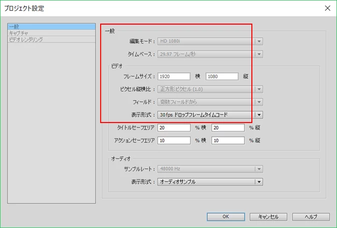 ④メニューの「編集」→「プロジェクト設定」→「一般」を選択して開いた「プロジェクト設定」ウィンドウのスクリーン