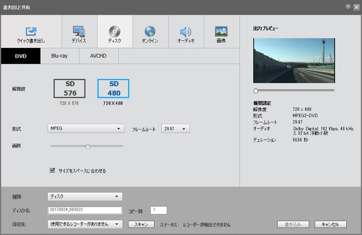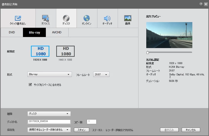 PCに書き込み可能型Blu-rayディスクドライブが搭載されていれば、Blu-rayディスクに書き出したほうが綺麗な映像で視聴できます。