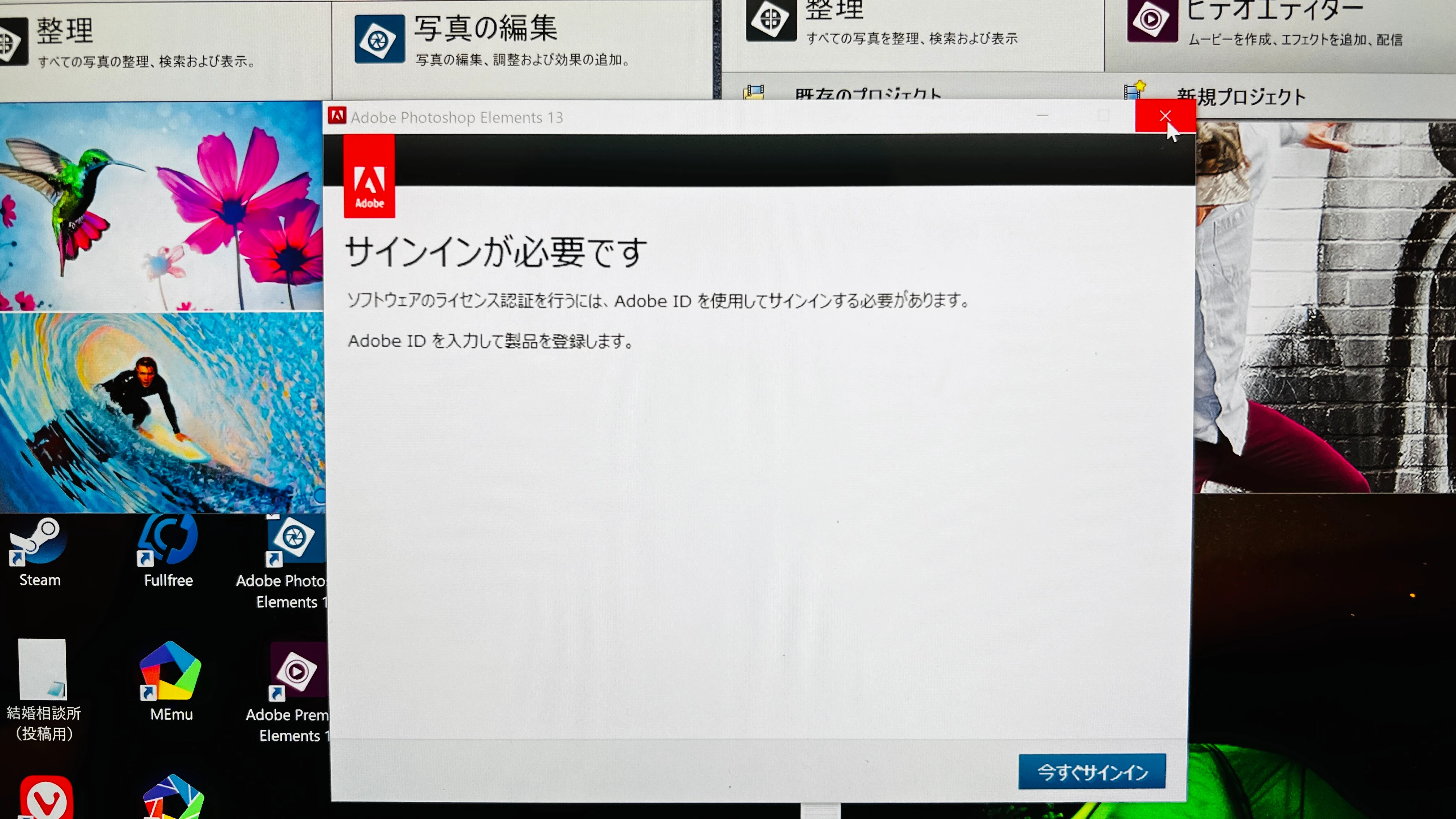 大地xxx4d9ParticipantForum|Forum|1 year agoAugust 24, 2024質問premier Elements13&Photo shop Elements13が開けませんForum|Forum|1 year agoAugust 24, 2024返信数 1.239 ビュー2015年に購入したpremier Elements13&Photo shop Elements13をWindows PCにインストールしました。 ライセンス認証完了して、新規プロジェクトまた写真の編集を押すと「サインインが必要です」と表示されサインインへと誘導されます。 サインインが無事完了して、再び新規プロジェクトまた写真の編集を押すとまた「サインインが必要です」が表示されこれが永遠に続きます。 どうすればクリアできるでしょうか。エラーまたは問題