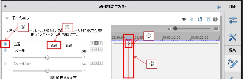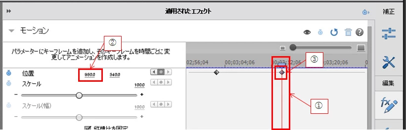 ④次に数値を「100.0」から徐々に小さくしていき、字幕(吹き出し)が表示される直前の位置でキーフレームを打ちます。