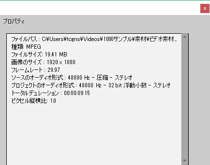 ⑤「プロジェクトのアセット」パネルで対象の映像素材の上で右クリックし、開いたコンテキストメニューから「プロパティ」を選択し、開いた「プロパティ」ウィンドウのスクリーンショットを提示頂けますか。下図のようなものです。スクリーンショットの貼り付け方が分からない場合は、そこの記載内容を正確に書き写してください。