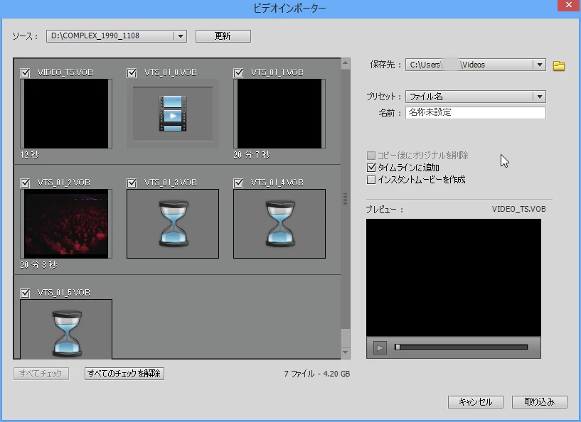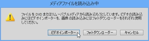 ビデオインポーターというので取り込んでいるみたいです。ちなみにVOBファイルをハードディスクにコピーして、ファイルとフォルダーから取り込んでみましたが同じでした。