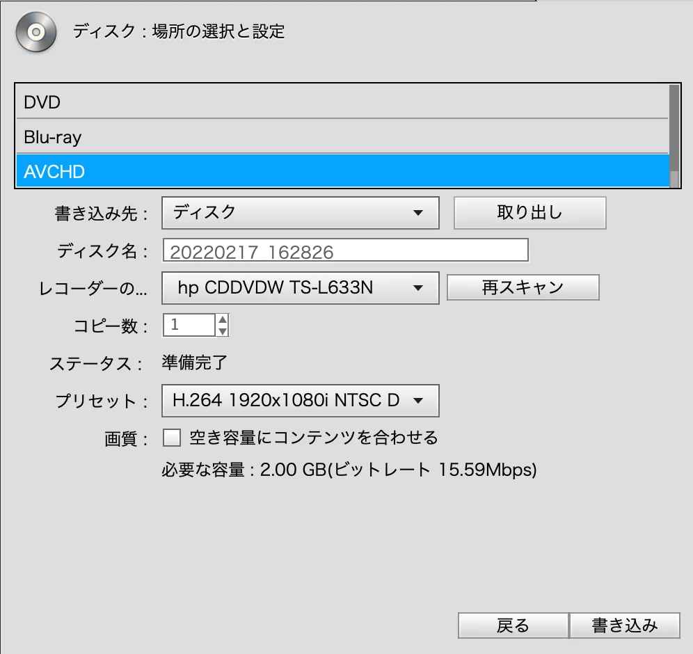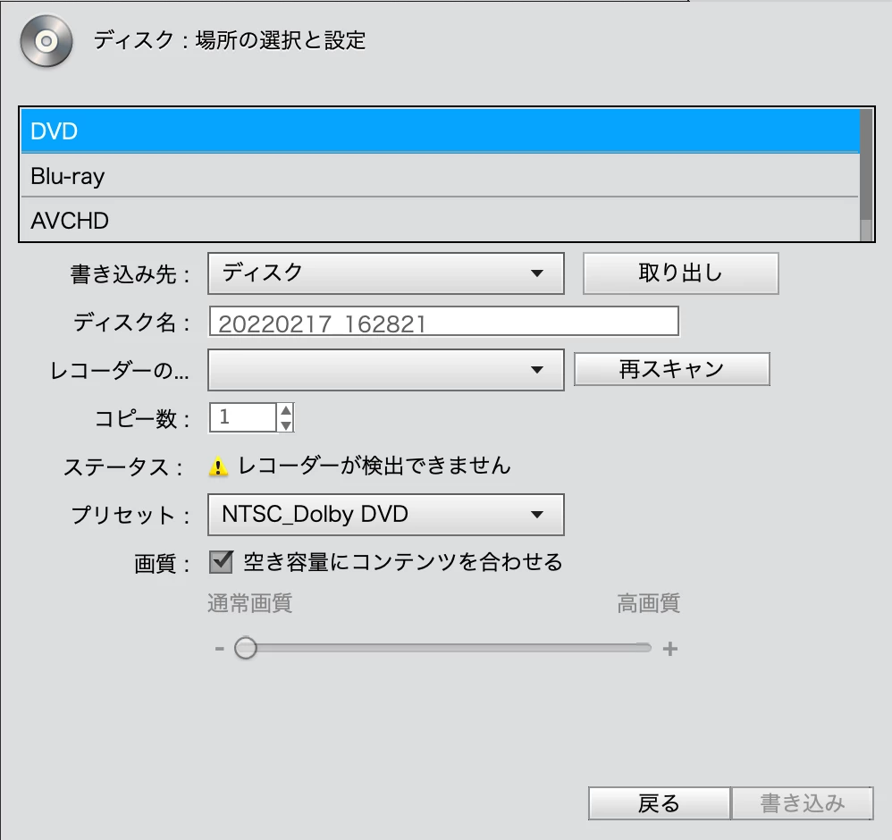 今まで問題なくDVDの書き込みが出来ていたのですが、なぜか「レコーダーが検出できません」と出しまい書き込む事が急にできなくなりました。DVDデバイスの問題かと思い新しく購入したのですが、問題解決にならず全く同じ状態です。「AVCHD」だと「準備完了」となり読み込みます。どうすればまた前のようにDVDでの書き込みができるのでしょうか?分かる方いましたら、どうぞよろしくお願いいたします。