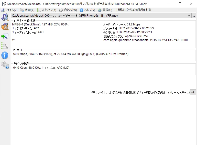 ※VFRになっていれば、Media Infoのウィンドウで右上のほうに「VFR」と記載されています。