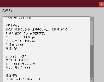 ①「プロジェクトのアセット」パネルで対象の映像ファイルの上で右クリックし、開いたコンテキストメニューから「プロパティ」を選択して開いた「プロパティ」ウィンドウのスクリーンショットを提示ください。下図のようなものです。