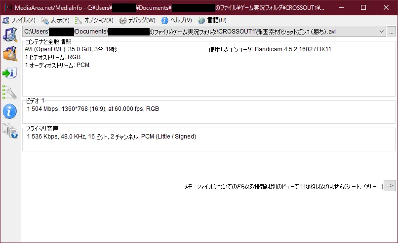 ②MediaInfoのスクリーンショットです。同じく黒く塗りつぶしてある部分は実名です。