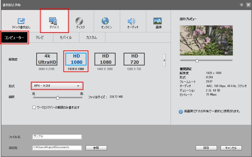 「書き出しと共有」から、「デバイス」→「カスタム」→「詳細設定」と選択し、