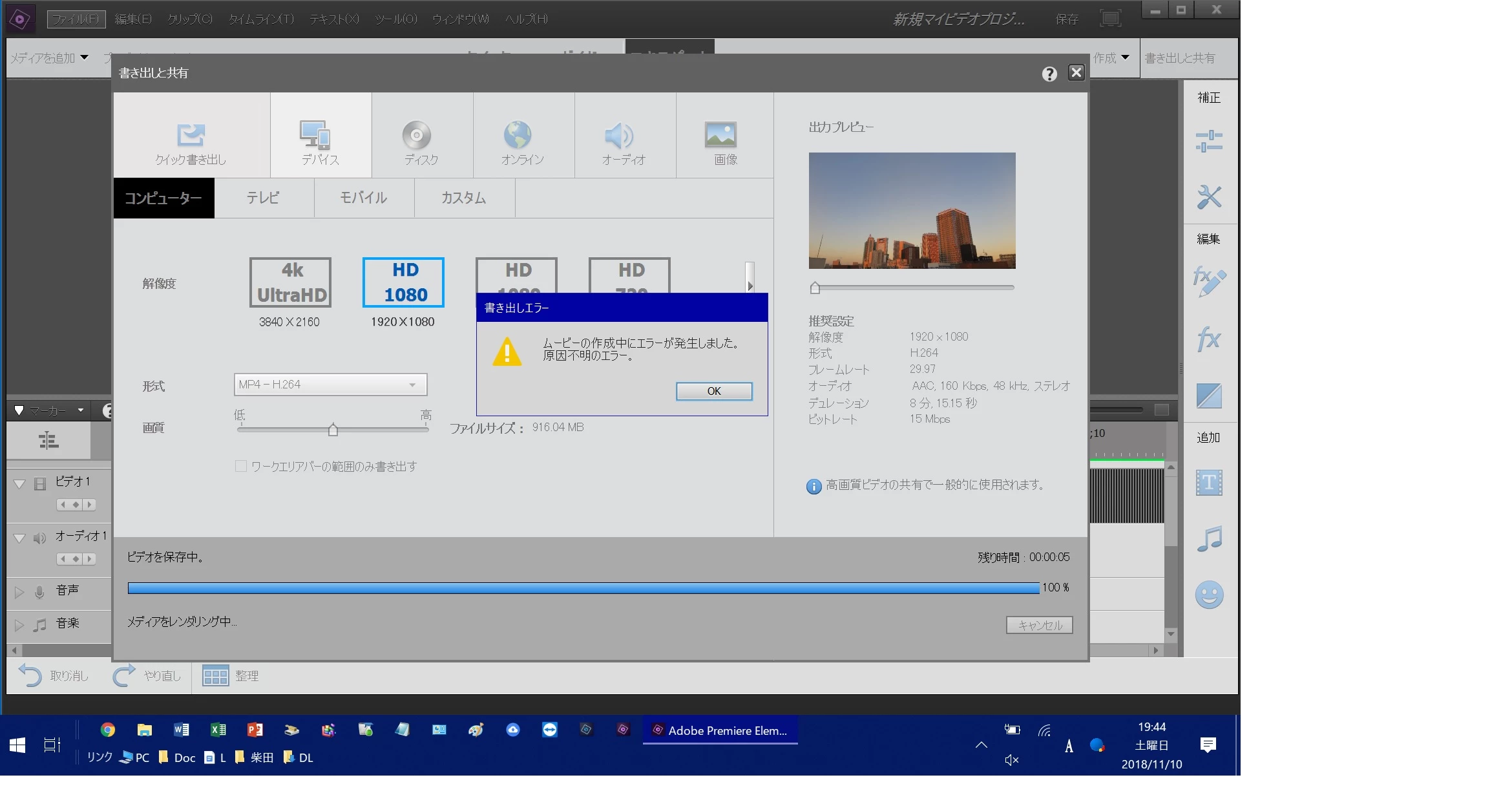 その後、ムービーの作成中に原因不明のエラーで、書き出しができなくなります。