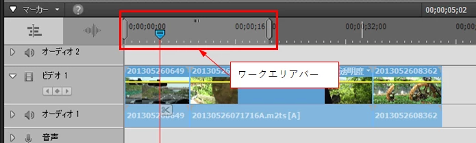 書き出し範囲の指定は、ワークエリアバー(下図赤枠部)で行います。両端の縦棒をドラッグすることで範囲を調整できます。