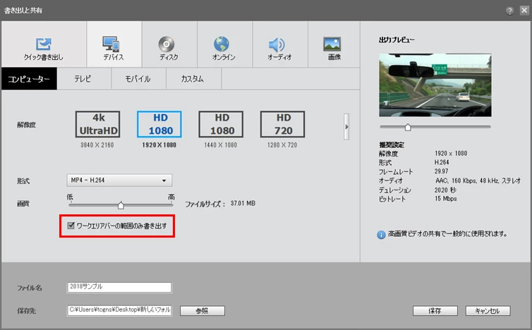 続いて、書き出し時に「ワークエリアバーの範囲のみ書き出す」にチェックを入れます(下図赤枠部)。