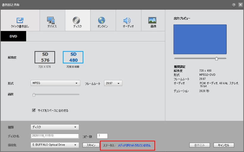 ②DVD-Rディスクをドライブに挿入した後、「書き出しと共有」をクリックして開いた「書き出しと共有」ウィンドウ」の「ステータス」項(下図赤枠部)に表示されている文言を正確に教えてください。