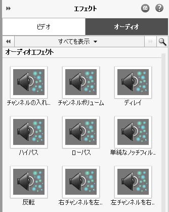 ※Premiere Elements 2023からは英語名のオーディオエフェクトはすべて削除されています。残っているのは日本語名の9個のみです(ご提示スクリーンショットの通りです)。