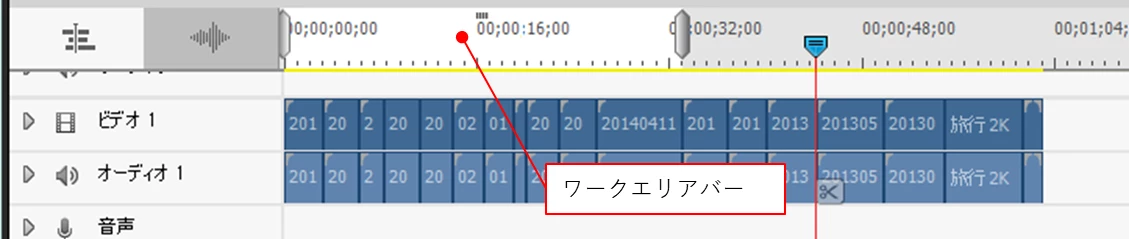 タイムラインパネルで書きだす範囲にワークエリアバーを設定します。下図は前半部に設定した例です。