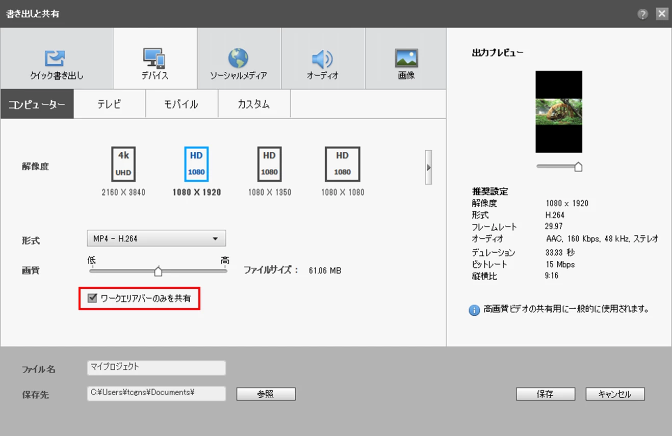書き出しと共有ウィンドウでは「ワークエリアバーのみを共有」にチェックを入れます。