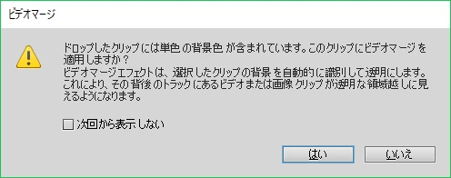 >「ドラッグ&ドロップした箇所には単色の背景・・・・・・このクリップにビデオマージを適用しますか?」との内容です。