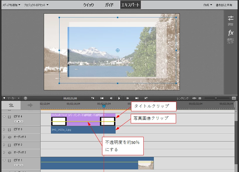 写真画像クリップとタイトルクリップのビデオトラックの上下を入れ替え、タイトルクリップを展開して上下幅を広くし表示された不透明度のラバーバンドを下にドラッグして不透明度を約50%にします。