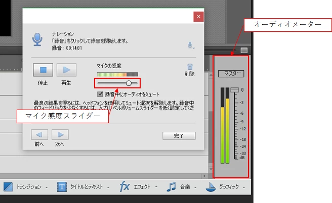 Premiere Elements14でナレーション作成するときにマイクからの音量が低くて困っています。