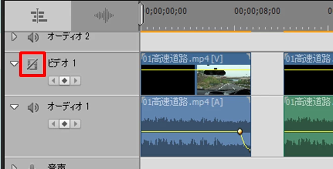 ⑤ビデオトラックのヘッダー部の「フィルム」アイコン(下図赤枠部)に斜線が入っていませんか。入っているとそのトラックのすべての映像クリップの映像が出ません。入っていたら、「フィルム」アイコンをクリックして斜線を消去します。