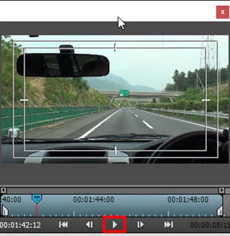 ②Premiere Elementsの「プロジェクトのアセット」パネルに読み込み、そのアセットをダブルクリックすると小さなウィンドウが開きます。そのウィンドウの下部にある「再生」ボタン(下図赤枠部)をクリックすると、映像・音声とも出ますか。