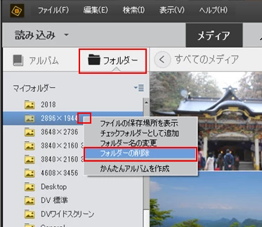 ①「整理(Elements Organizer)」を開いて、「フォルダー」タブを選択し、フォルダーを表示させます。続いて削除するフォルダーの上で右クリックし、開いたコンテキストメニューから「フォルダーの削除」を選択します。