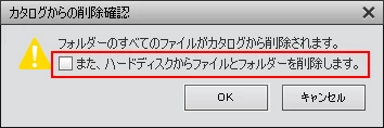 ・フォルダーとファイルをカタログとHDDから削除する場合は、「また、ハードディスクから・・・・削除します。」にチェックを入れて「OK」をクリックします。チェックを入れるとデータがHDDからも削除されますので注意が必要です。