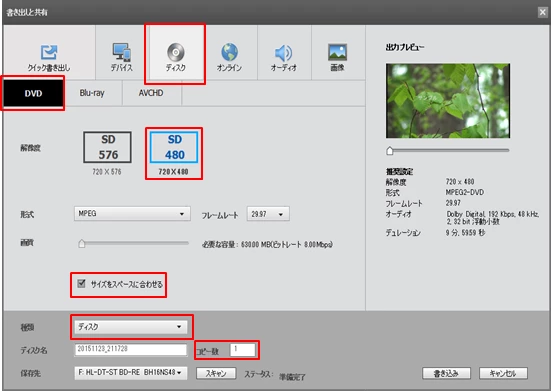 書き出しと共有→DVD→種類をディスクに変更→ディスク名・コピー数を設定