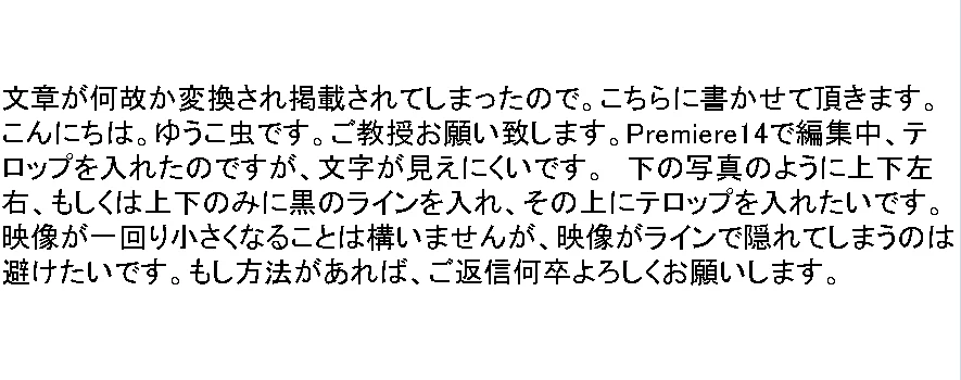 テロップを入れたいです。もちろん絵は小さくなって構いませんが、ラインで映像そのものが隠れてしまうことは避けたいです。Premiere14では限界があるでしょうか。。?