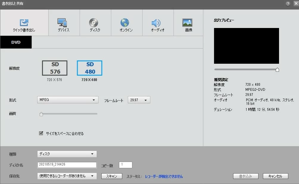 しかしISOには書き出せますが、レコーダーが検出できない状態で、DVDに直接書き込めない状況です。