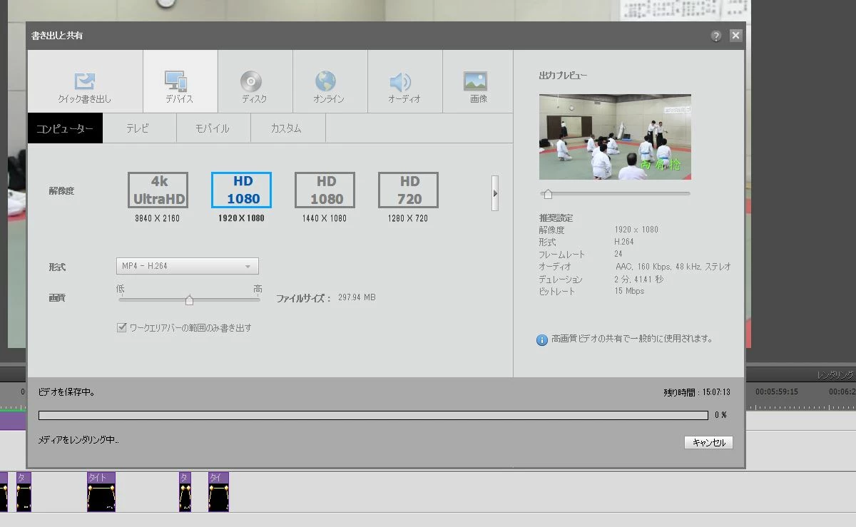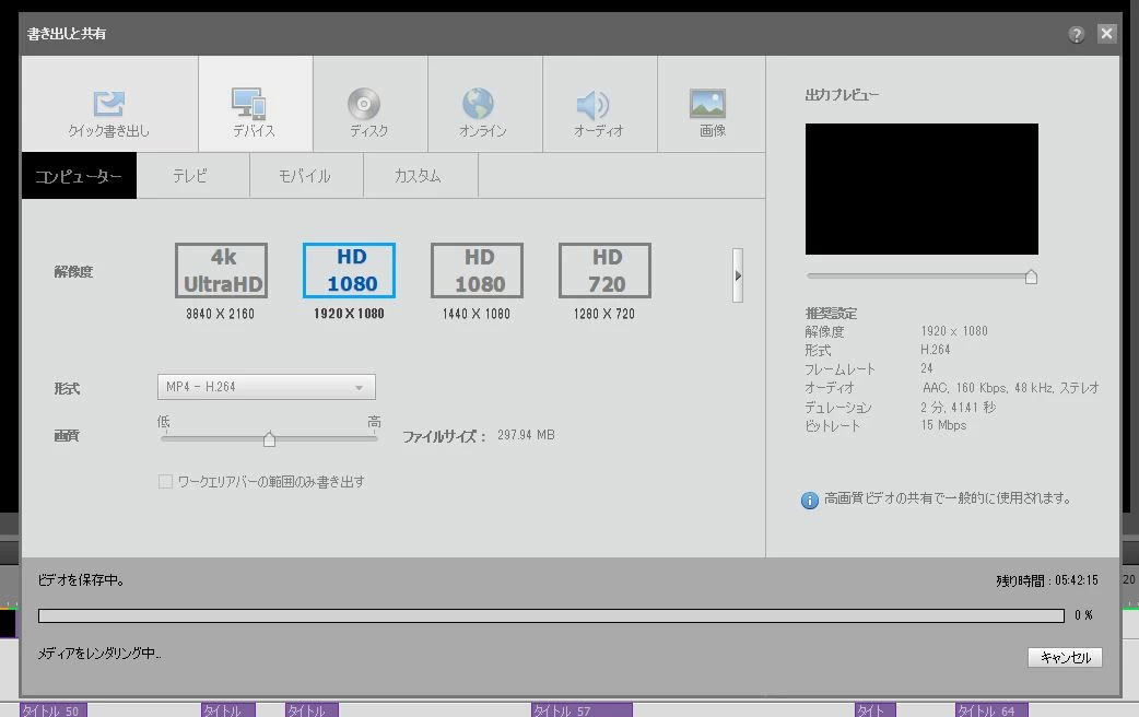プロジェクト設定を下記の通り手動で行い、ハンディカムで撮影した映像素材を何個か並べて(同じ素材でも可)2~3分の尺に書き出してみます。