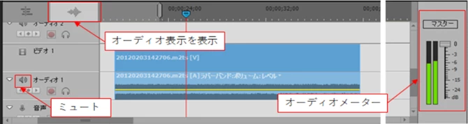 「オーディオ表示を表示」ボタンをクリックして「オーディオメーター」を表示し、タイムラインを再生して「オーディオメーター」が振れているか確認します。