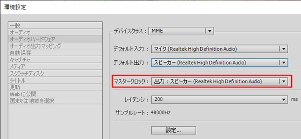 さらに環境設定の「デフォルト入力」と「デフォルト出力」は設定が合っていますが、「マスタークロック」がおかしい可能性があります。