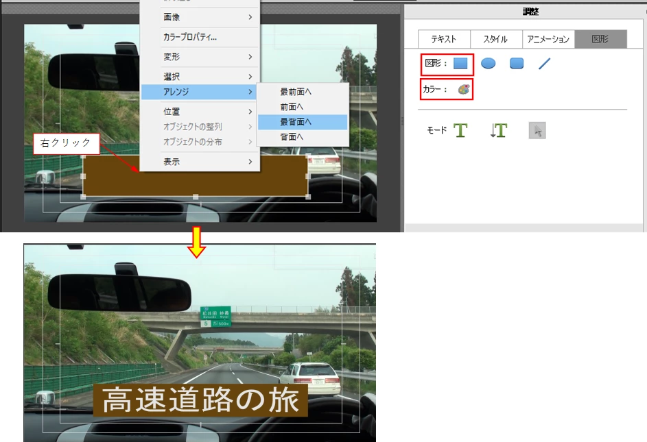 座布団は「図形」の「長方形ツール」で作成し、「カラー」で色を塗ります。文字を先に作成した場合は上書きされて見えなくなってしまいますので、座布団の上で右クリックし開いたコンテキストメニューから「アレンジ」→「(最)背面へ」を選択すると、文字が前面に表示されます。
