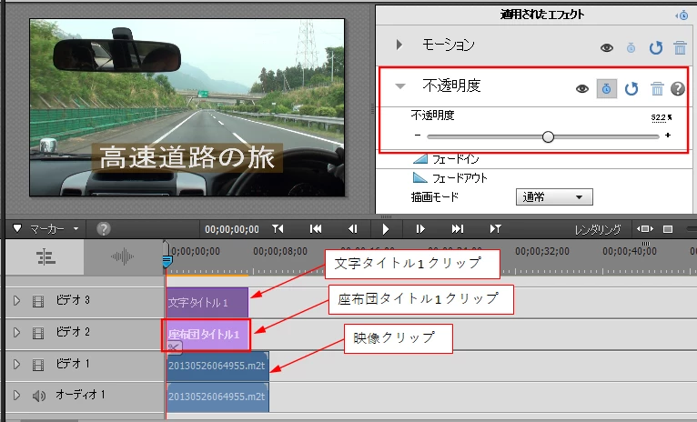 Premiere Elementsのタイトラーには不透明度をかけるコマンドが用意されていませんので、文字と座布団は別のタイトルクリップで作成します。座布団のクリップに「適用されたエフェクト」の「不透明度」エフェクトをかけて半透明にします。これがちょっと面倒くさいところです。