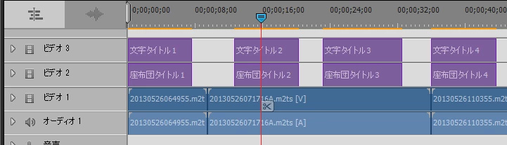 ⑧これらのタイトルクリップをビデオトラックへ配置します。