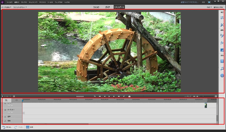 または、エクスプローラー(Windowsの場合)から映像素材ファイルを、Premiere Elementsのワークエリア(下図赤枠部)へ直接ドラッグ&ドロップします。