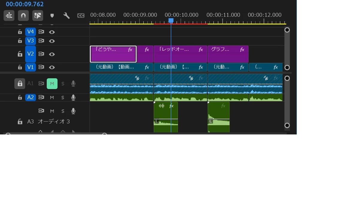 この線の部分は「レンダリングバー」と呼ばれるものでして、赤くなっている部分は「GPU高速処理ができないタイプのエフェクト・素材(フレームサイズが巨大など)がある箇所」もしくは「処理が重いエフェクトなどがある箇所部分」と捉えていただくと良いのではないかなと思います。