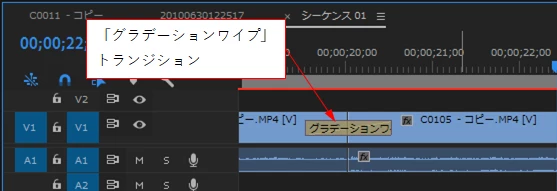 ①切り替え前の動画をV2に配置、切り替え後をV1に配置。
