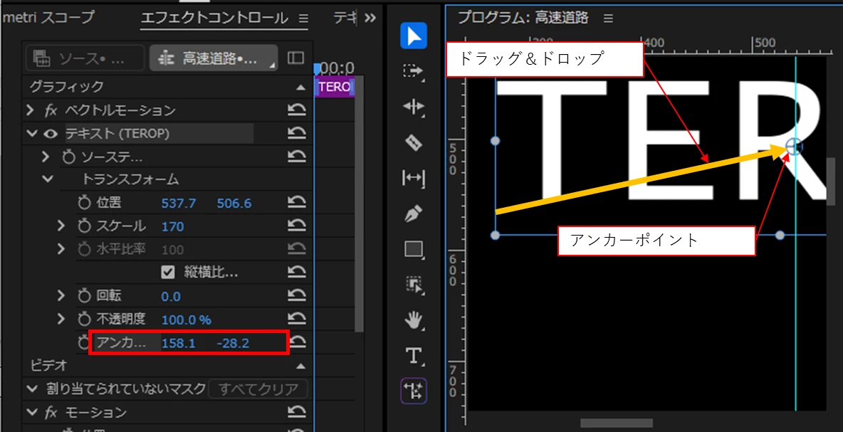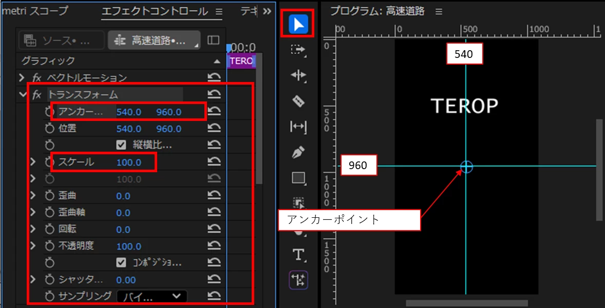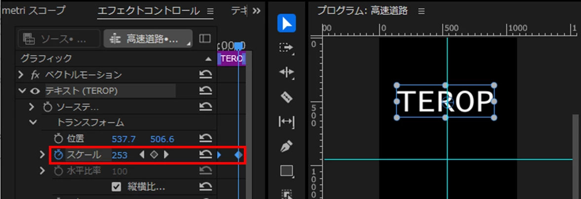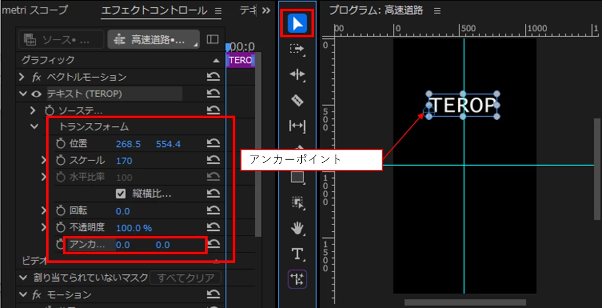 以前、”プログラムモニターのテロップ部分をクリックすると、〇の中に十字架が入っているマークが2つ出てくるので、その位置をマウスをドラックしながら2つともテロップの中心に持ってくる”と修正できる旨を教えていただいたことがあったのですが、そのマークは今回ひとつしか見当たりません。