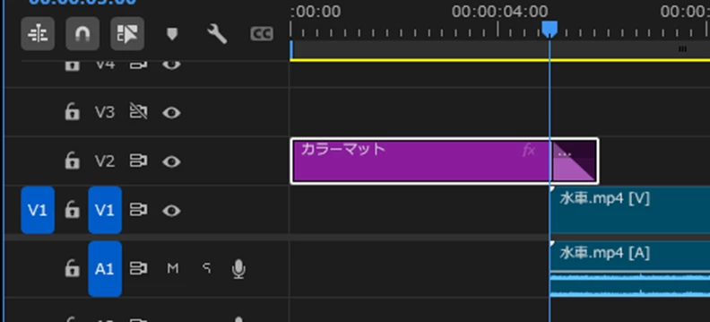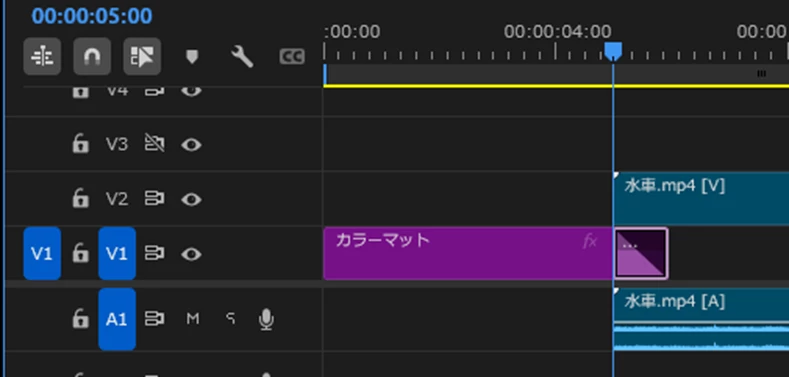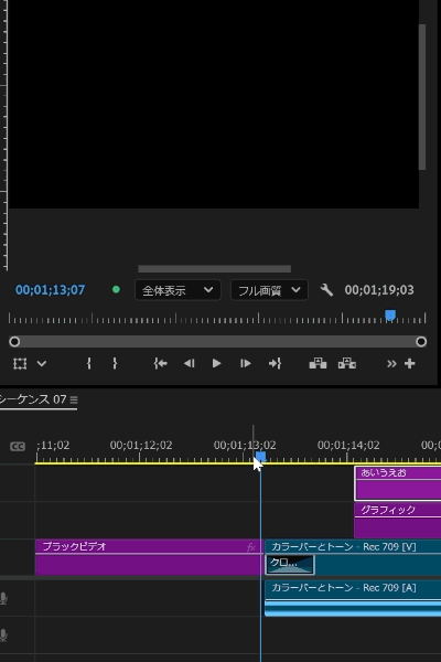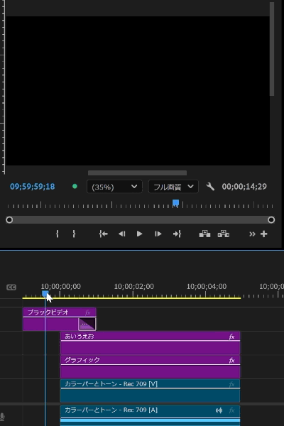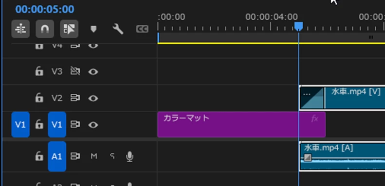 画像のように作成した動画に被せるようにカラーマットを入れて、クロスディゾルブで始めるようにするみたいなのですが、