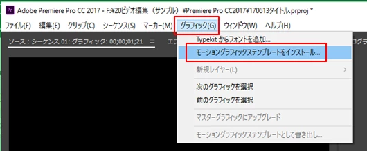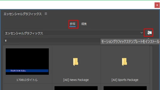 ①「エッセンシャルグラフィックス」パネルで「参照」を選択し、「場所を選択」メニューの右側にある「モーショングラフィックステンプレートをインストール」ボタンをクリックするか、またはメニューの「グラフィック」→「モーショングラフィックステンプレートをインストール」を選択します。