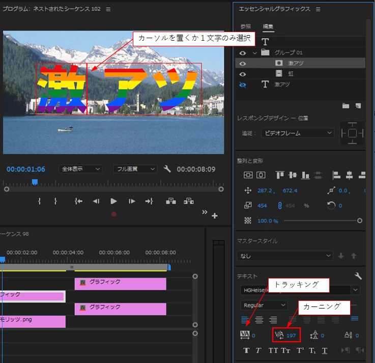 カーニングは文字の前にカーソルを置くか1文字のみを選択します。お試しください。