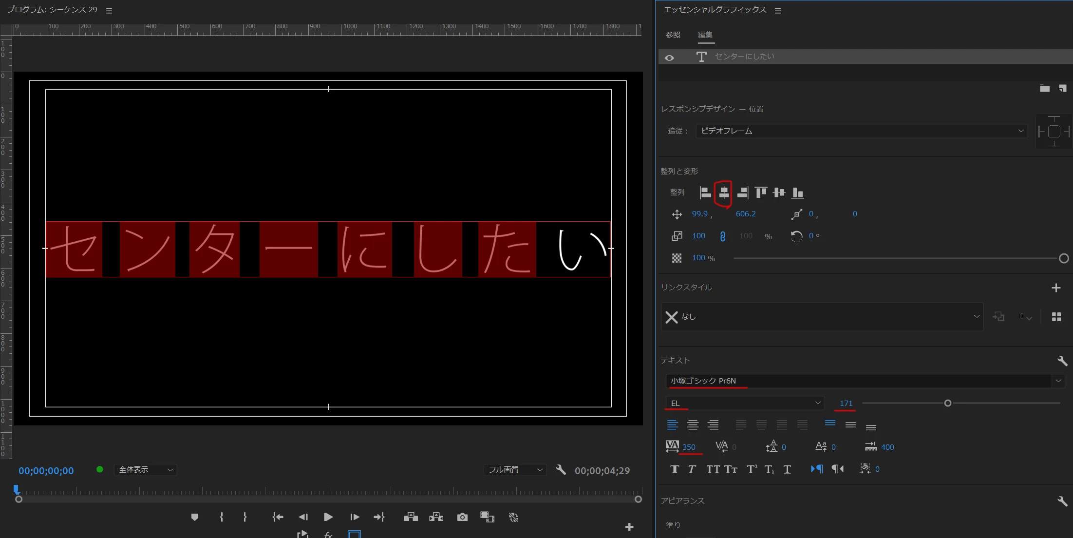 エッセンシャルグラフィックスのテキストがセンターに来ません