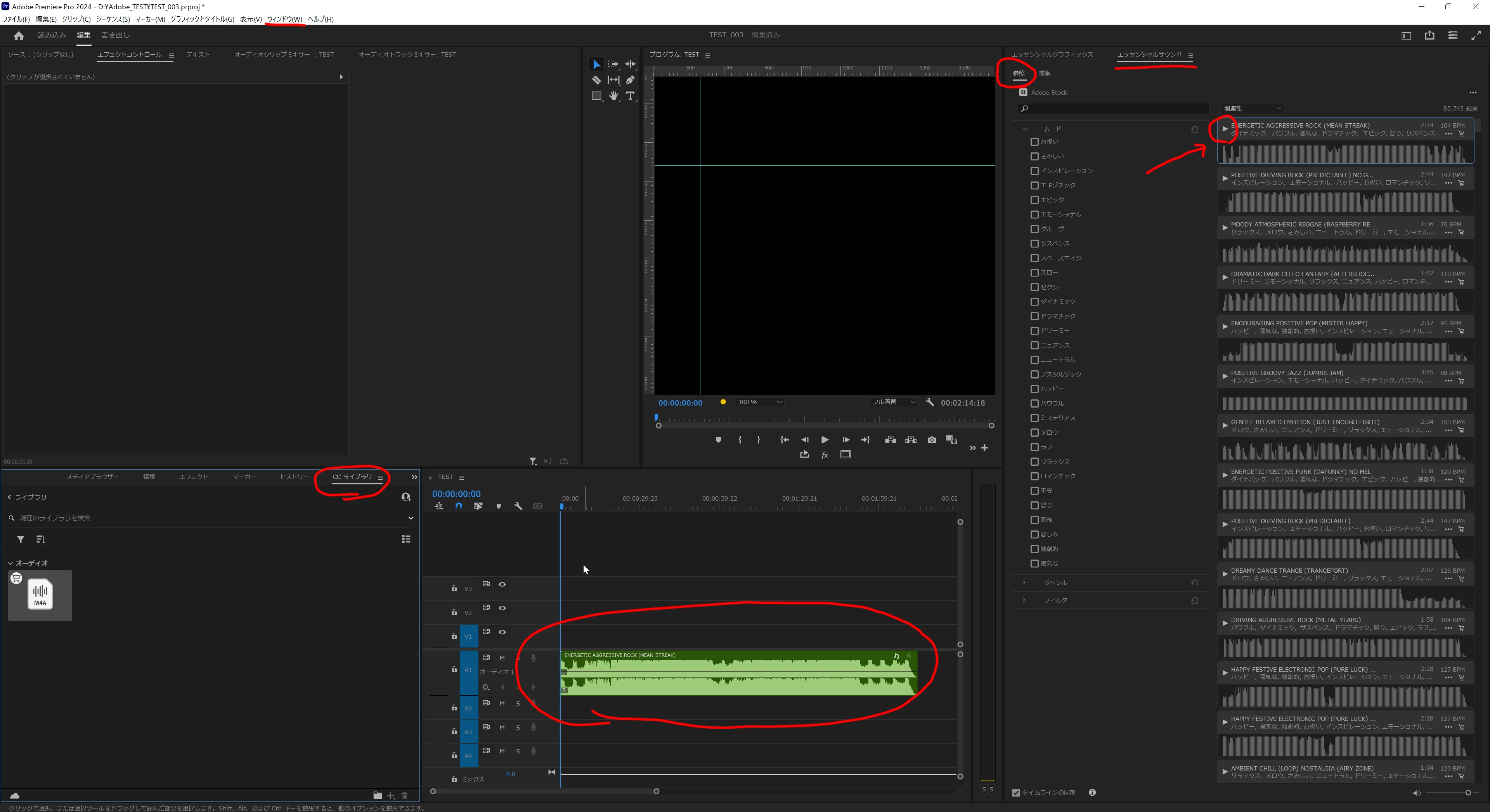 こちらは私の手元の環境での状況なのですが、画面右側のように「参照」タブを選んだ際に楽曲のリストと波形表示が出るか否か、右上の赤丸で囲った再生ボタンを押すと音楽が出るか否か、そして左下の「CCライブラリ」のウィンドウの表示がどのようになっているかといったことがポイントになってくるかと思います。