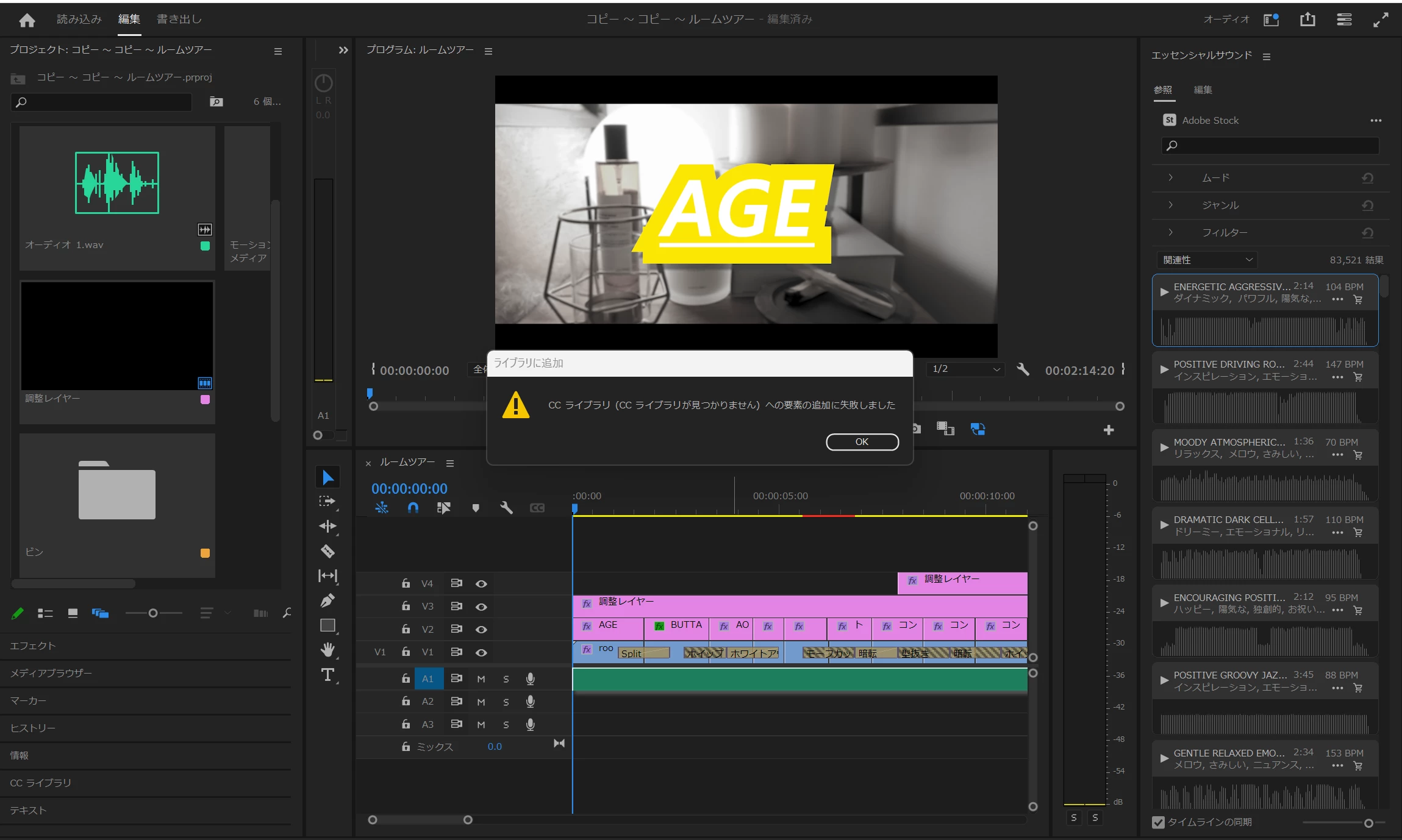 エッセンシャルサウンドからオーディオをタイムラインに追加しても音が鳴らない