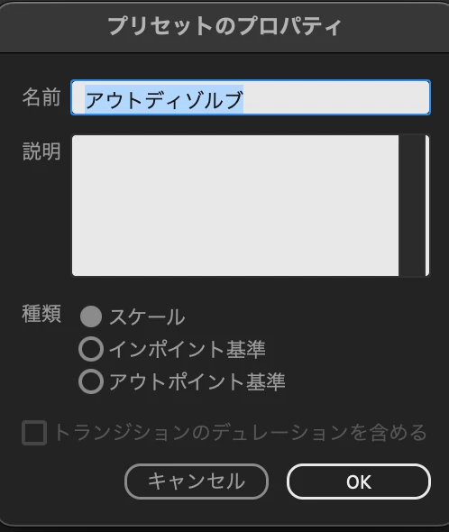 そのプリセットの設定内容(説明、種類、トランジションのデュレーションを含めるか否か)を、編集者が事前に確認したり編集できるようにするためだと思います。最後に「OK」をクリックすれば、ウィンドウは閉じます。これは仕様ではと思います。