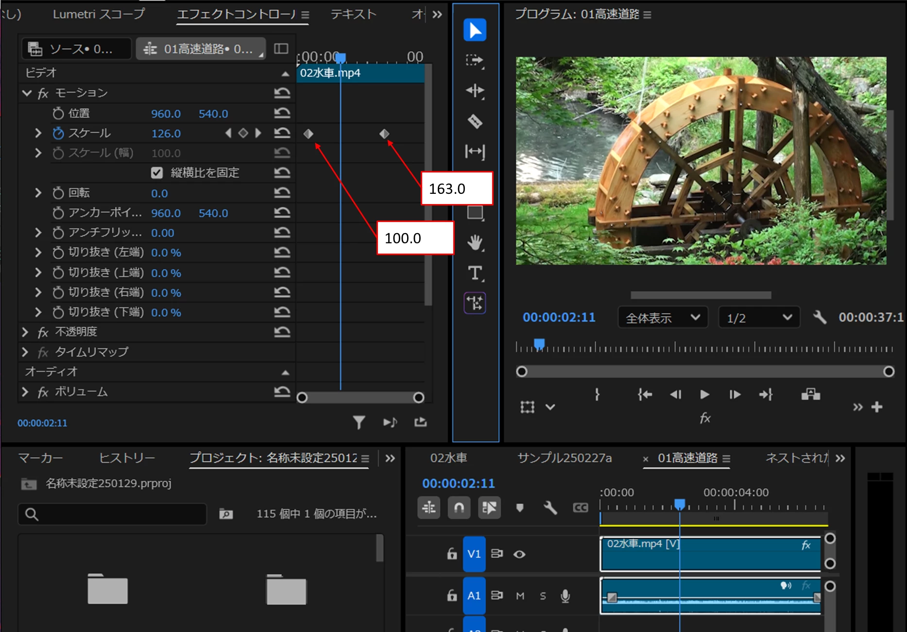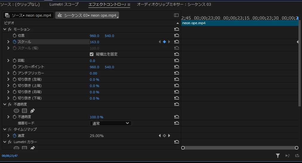 タイムリマップを先に適用した場合は、このクリップをネストしてからモーション(スケール等)を適用すると良いです。
